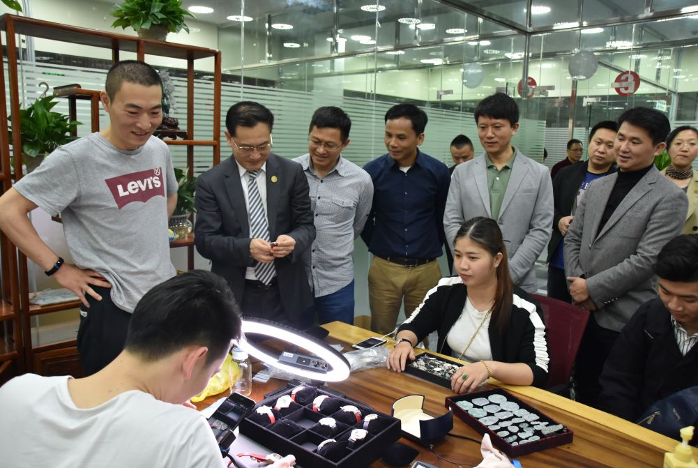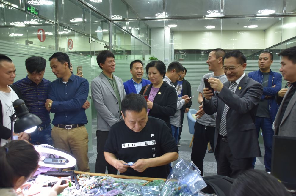 在臧总的陪同下,中宝协向导一行旅行了玉博城一层、二层、三层的翡翠市场,兴致勃勃地旅行了商城内挂饰、摆件等琳琅满目、种类繁多的翡翠精品。电商直播作为翡翠行业新兴的营销方法颇受商家青睐。毕立君秘书长还特意旅行了商城二层电商直播区,并与电商商户亲热攀谈,详细相识目今电商的生长现状及未来运营思绪。