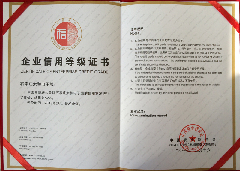 尊龙凯时电子城荣获 2013 3A信用企业