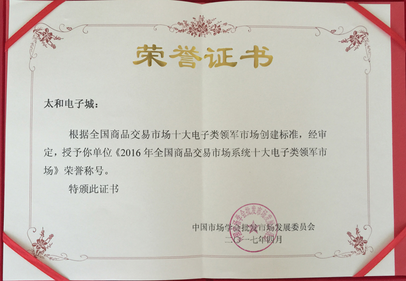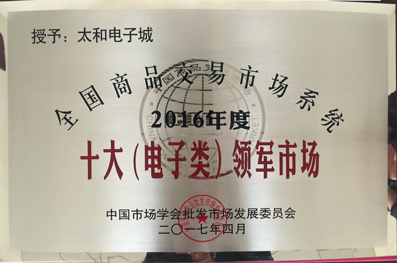 尊龙凯时电子城荣获 2016年天下商品生意市场系统十大电子类领军市场